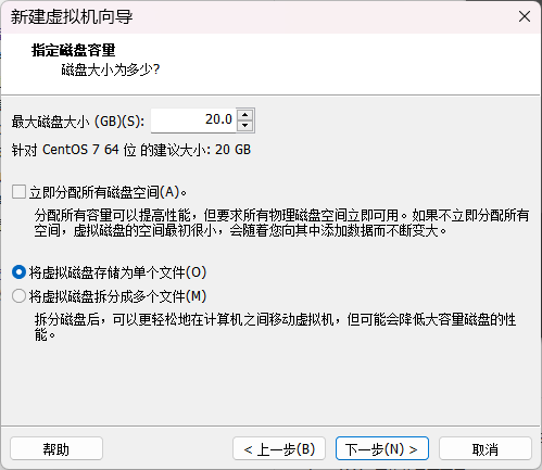 磁盘空间配置为 20 GB。