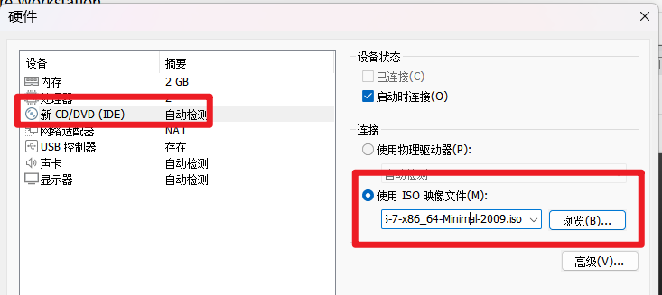 在虚拟机设置将 CD/DVD 设备连接到 ISO 文件。