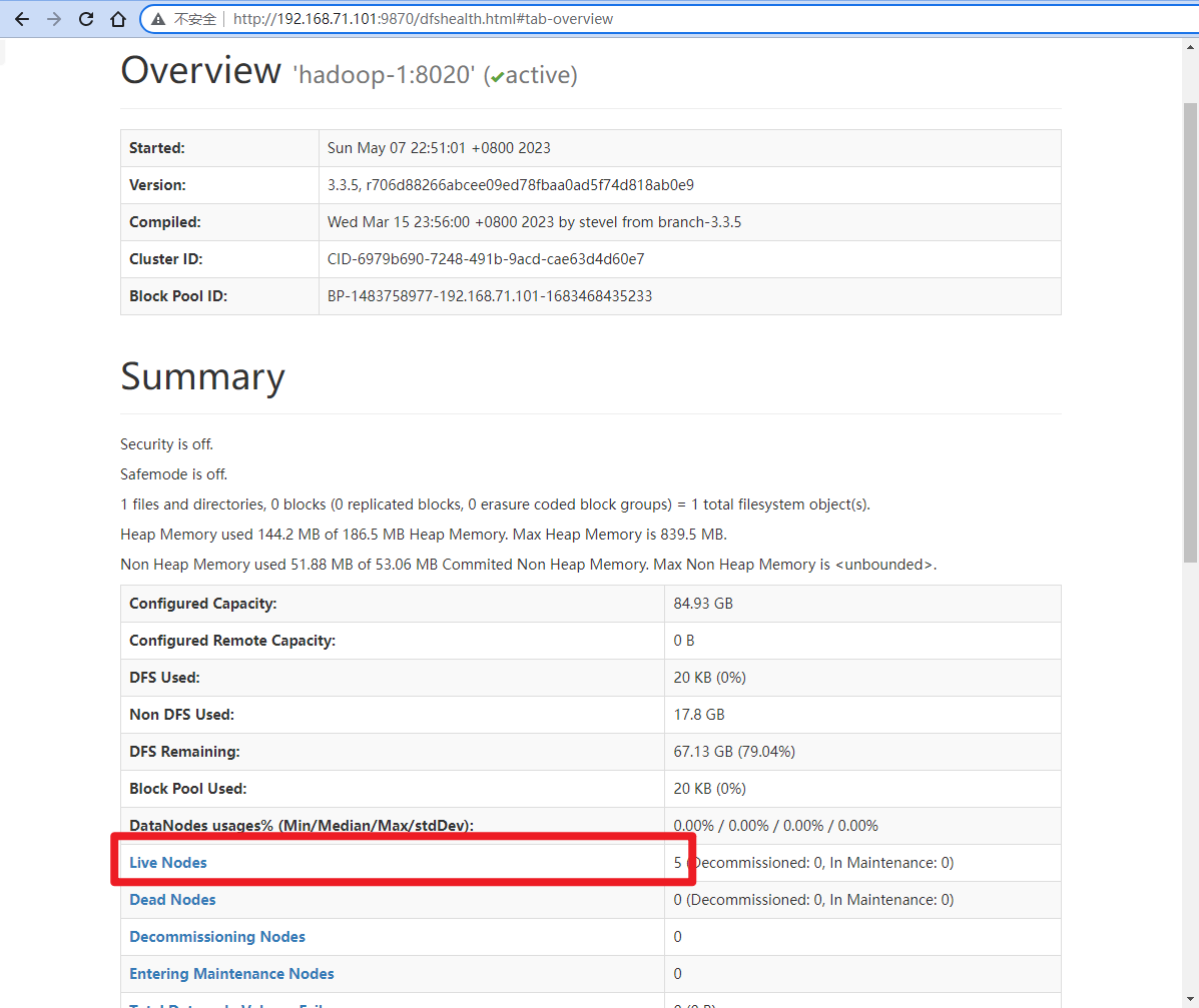 访问 http://192.168.71.101:9870/ 可以看到 NameNode 的状态。